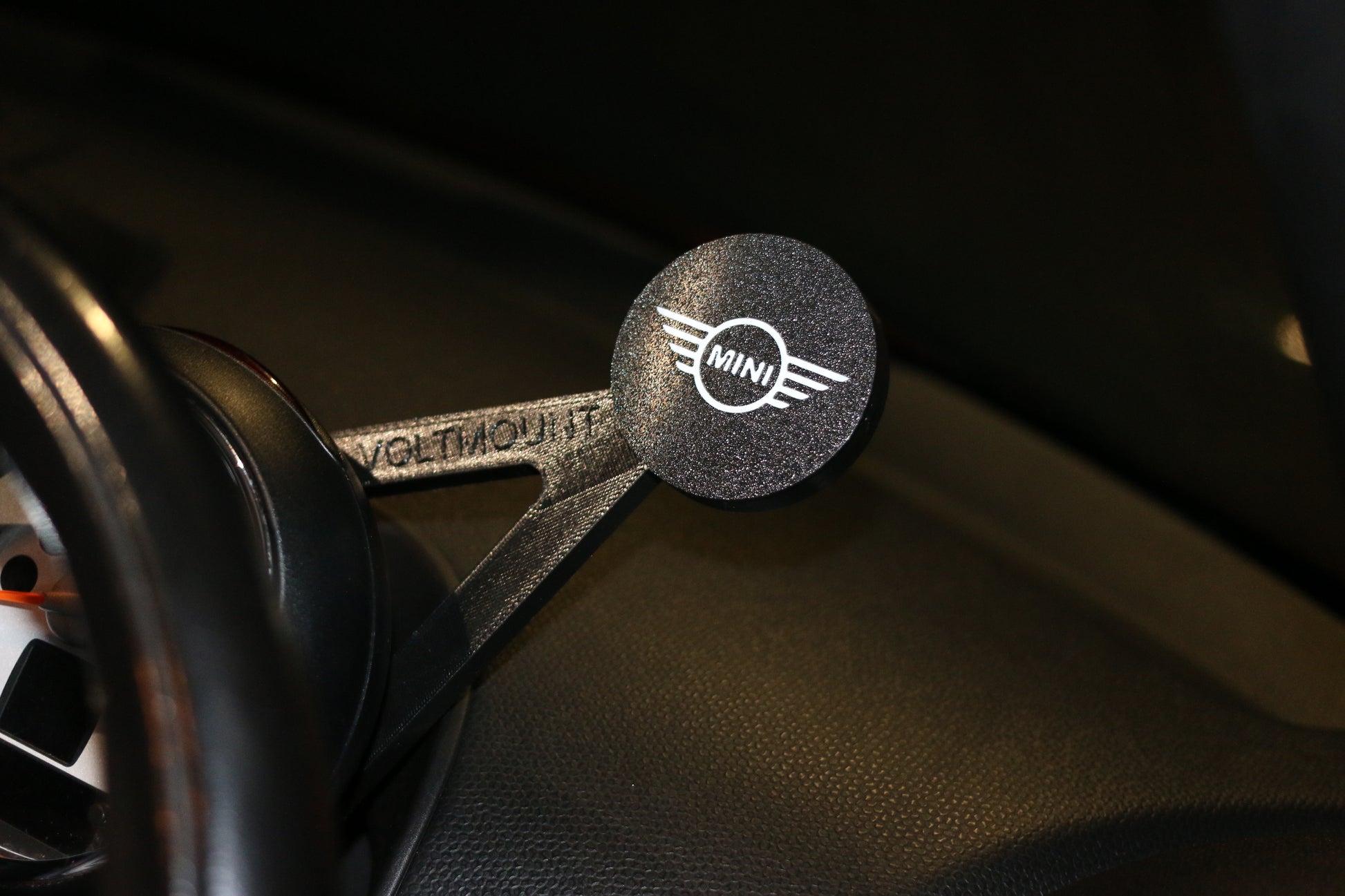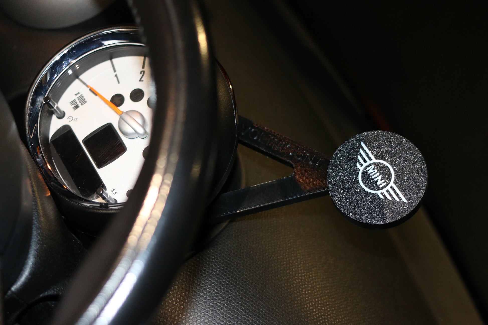 Custom made for the Mini, it uses 3 screws that are already on the vehicle, you unscrew the screws behind the Rev Counter, place the mount in place and then replace the screws.