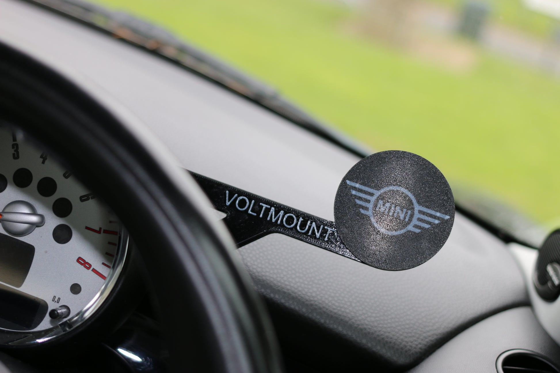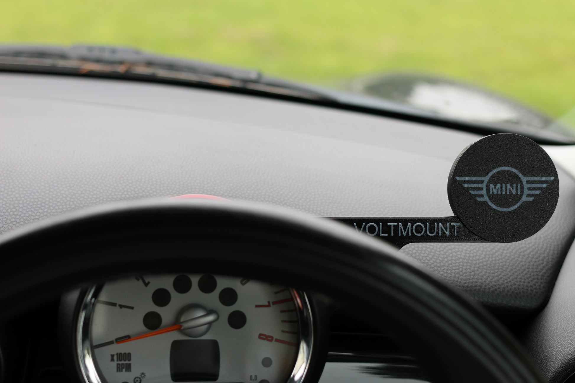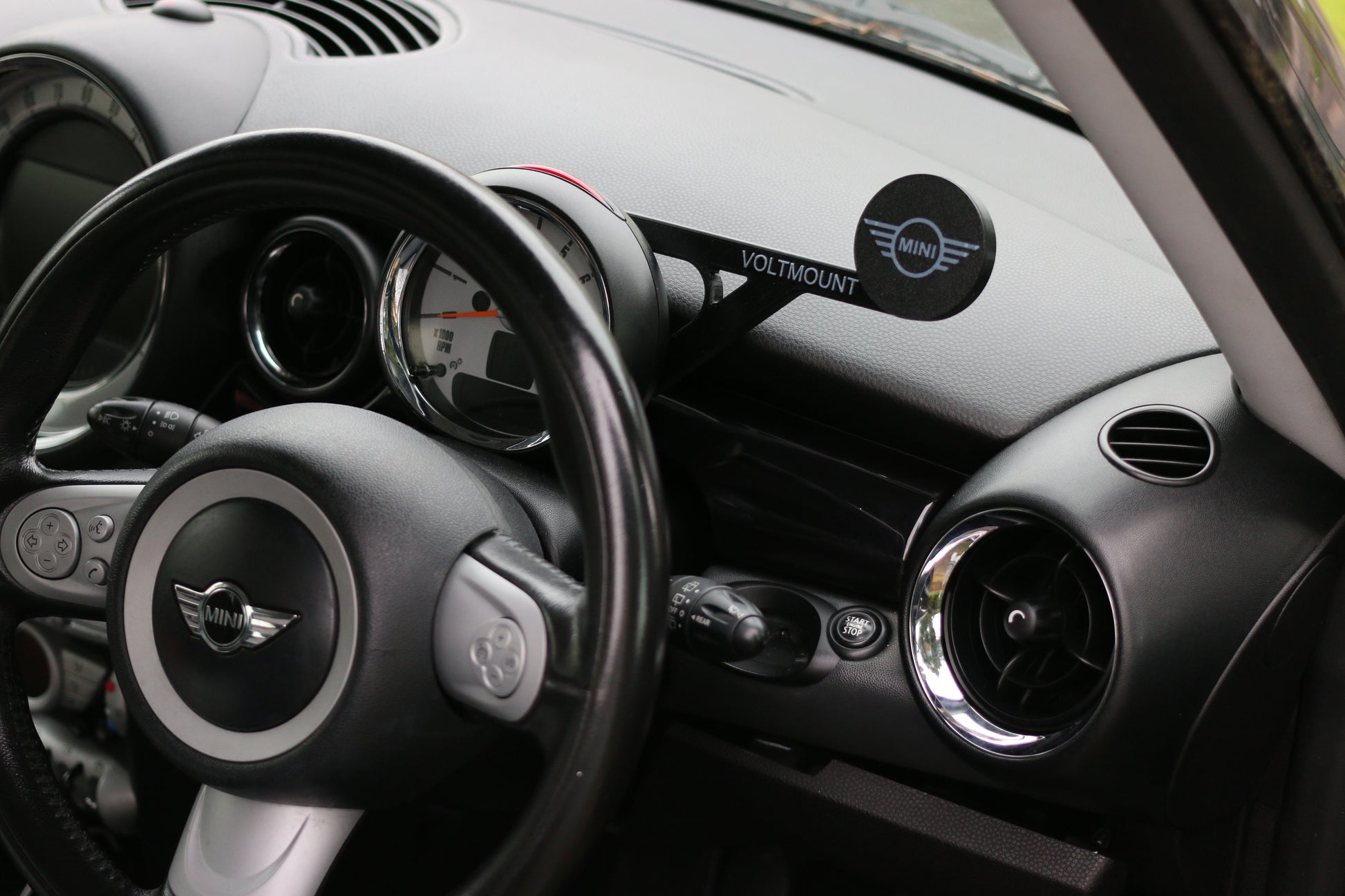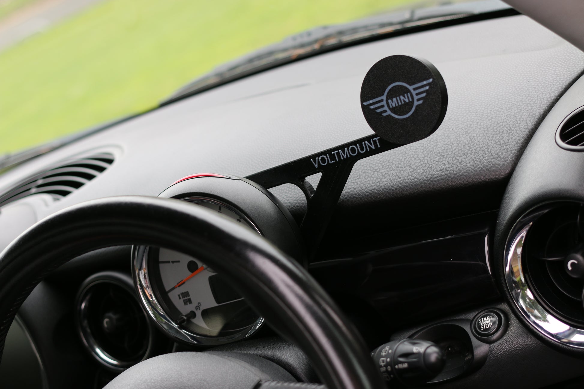 Custom made for the Mini, it uses 2 screws that are already on the vehicle, you unscrew the screws behind the Rev Counter, place the mount in place and then replace the screws.