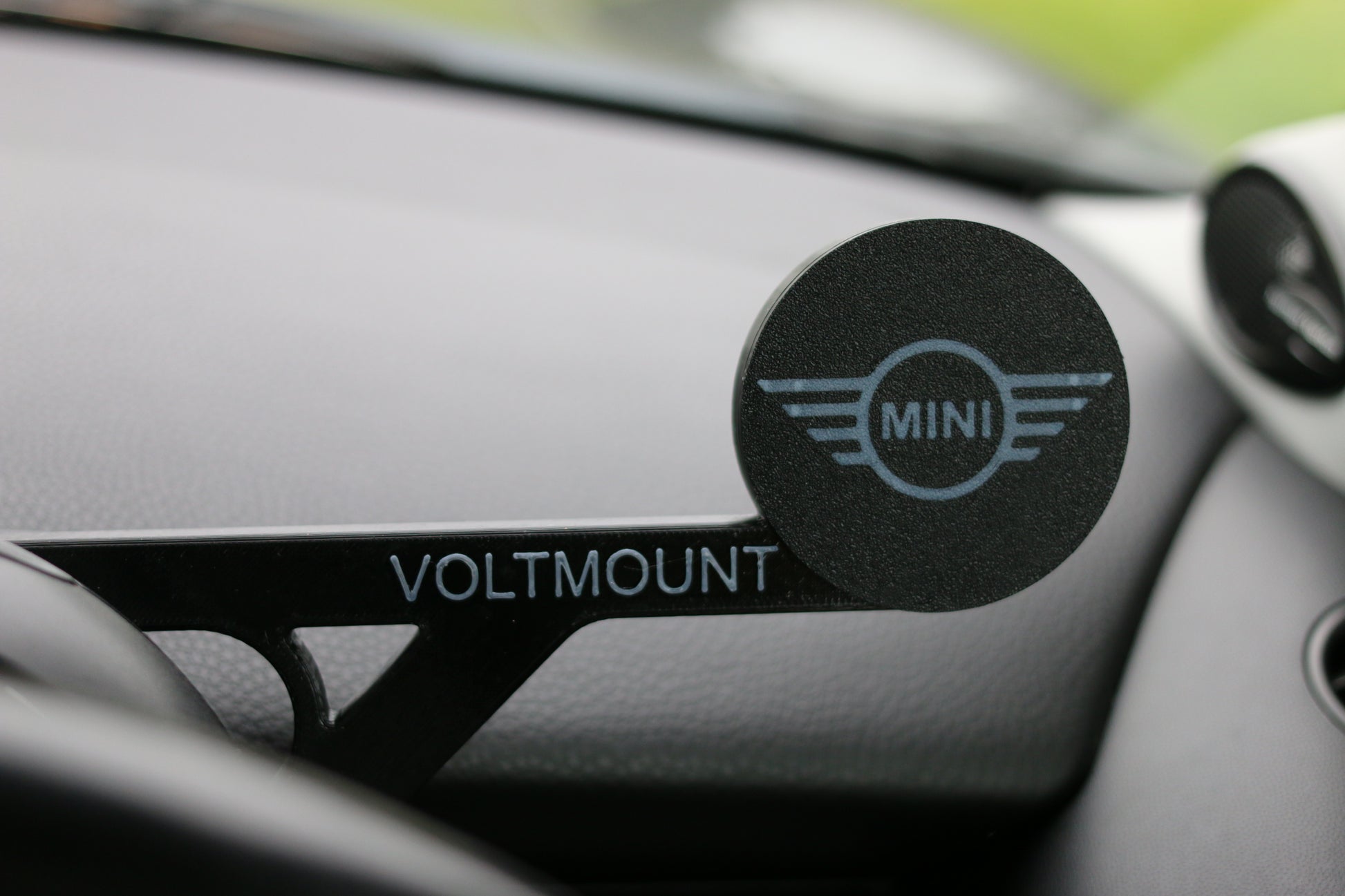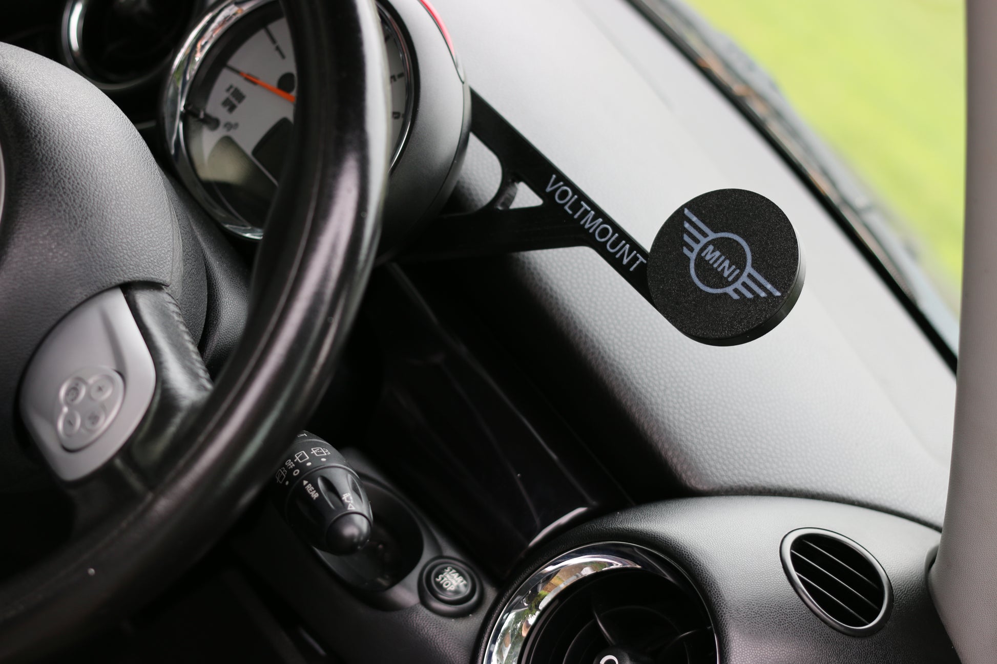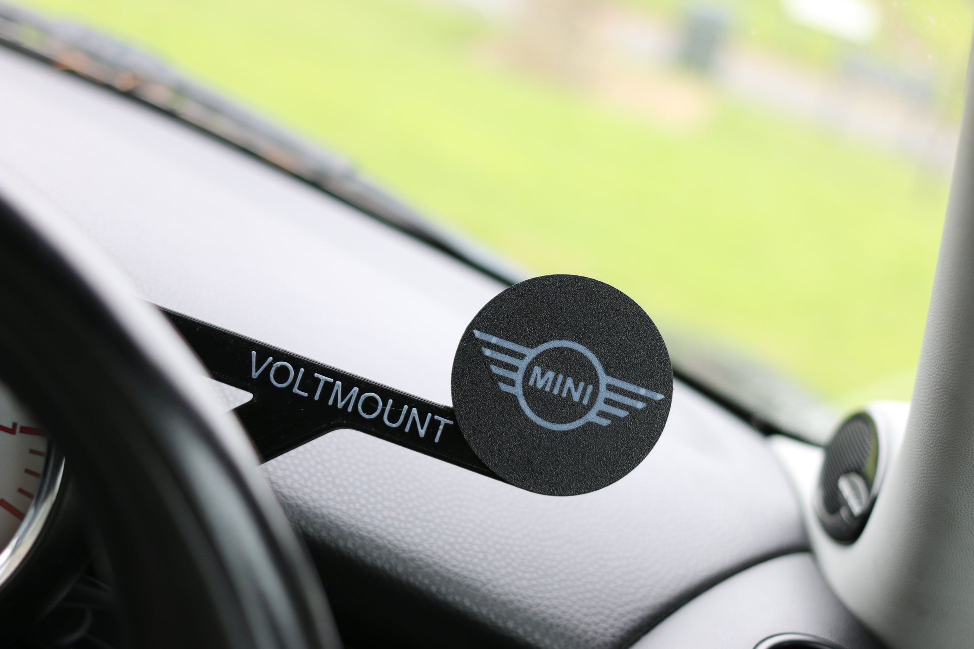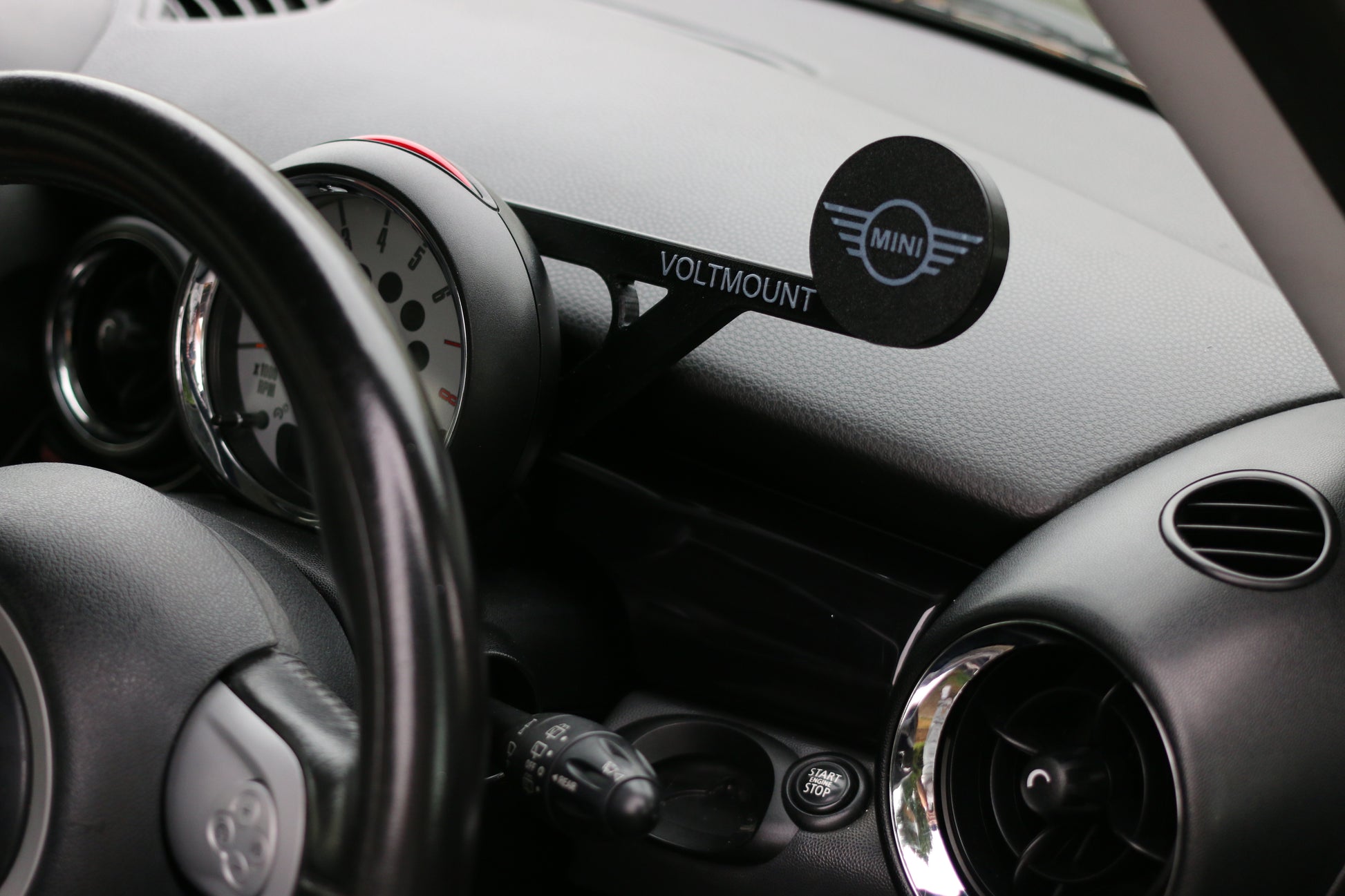 Custom made for the Mini, it uses 2 screws that are already on the vehicle, you unscrew the screws behind the Rev Counter, place the mount in place and then replace the screws.