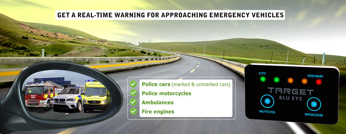 - Warns you in advance for approaching emergency services such as marked and unmarked police cars, ambulances and fire engines.